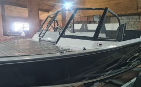 Лодка с дополнительной комплектацией: Установка электростеклоочистителя правого стекла, Стояночно-ходовой тент из фирменной яхтенной ткани, Бензобак емкостью 105 литров,Кормовые кринолины (площадки) из рифленого алюминиевого листа Квинтет с рундуками с двух сторон, Трап кормовой нержавеющий выдвижной, Люк в пайоле перед передними сидениями, Шторка на молнии левой бортовой полочки, Шторка на молнии правой бортовой полочки и т.д.